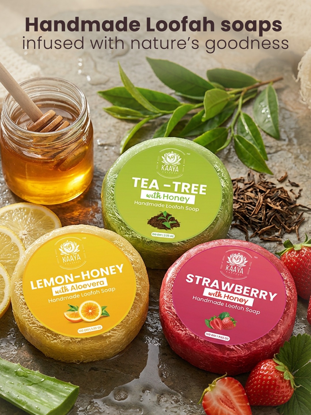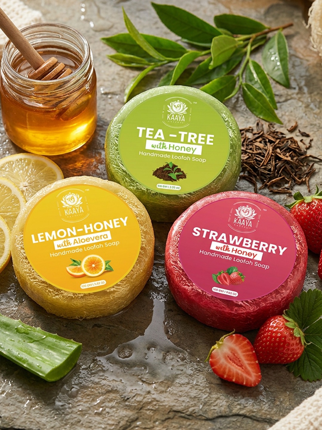 Kaaya Natural Strawberry, Tea Tree, Lemon With Honey Handmade Loofah Soap – 100 Gm | Pack of 3