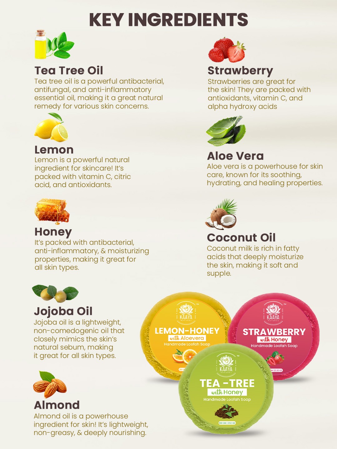 Kaaya Natural Strawberry, Tea Tree, Lemon With Honey Handmade Loofah Soap - 100 Gm | Pack of 3